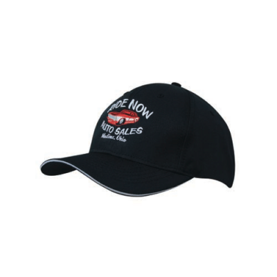 Breathable poly twill with mesh back. Structured 6 panel cap. Pre-curved peak with contrast stitching twin hole plastic snap